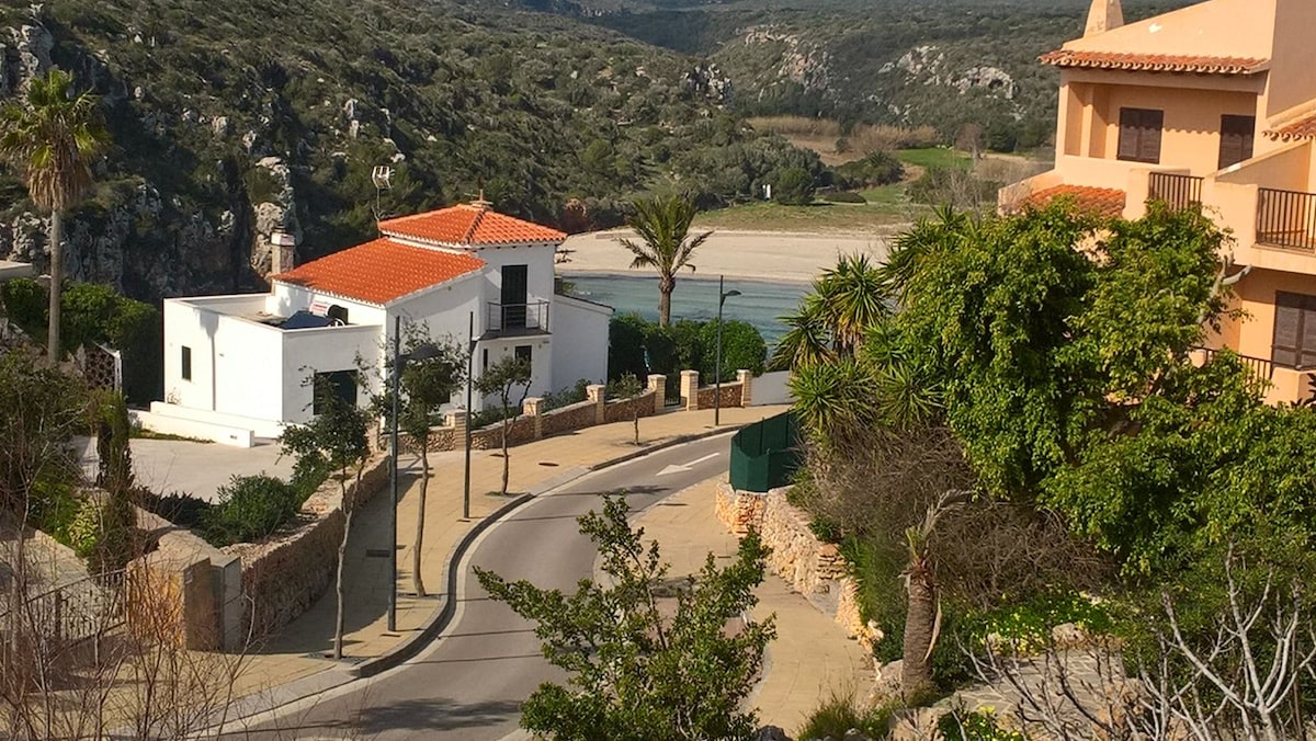 Our typical "casita menorquina" is situated 100m from Cala Blanca, a lovely crystal clear small beach with restaurants and bars. It's located in a very tranquil neighbourhood, inside a small condo with 3 other similar houses sharing a big swimming pool. The house has a big private outdoor area with garden and BBQ facilities and... the best... a rooftop terrace with chill out area and a gorgeous sea/sunset view. The house has 2 rooms with air conditioning.