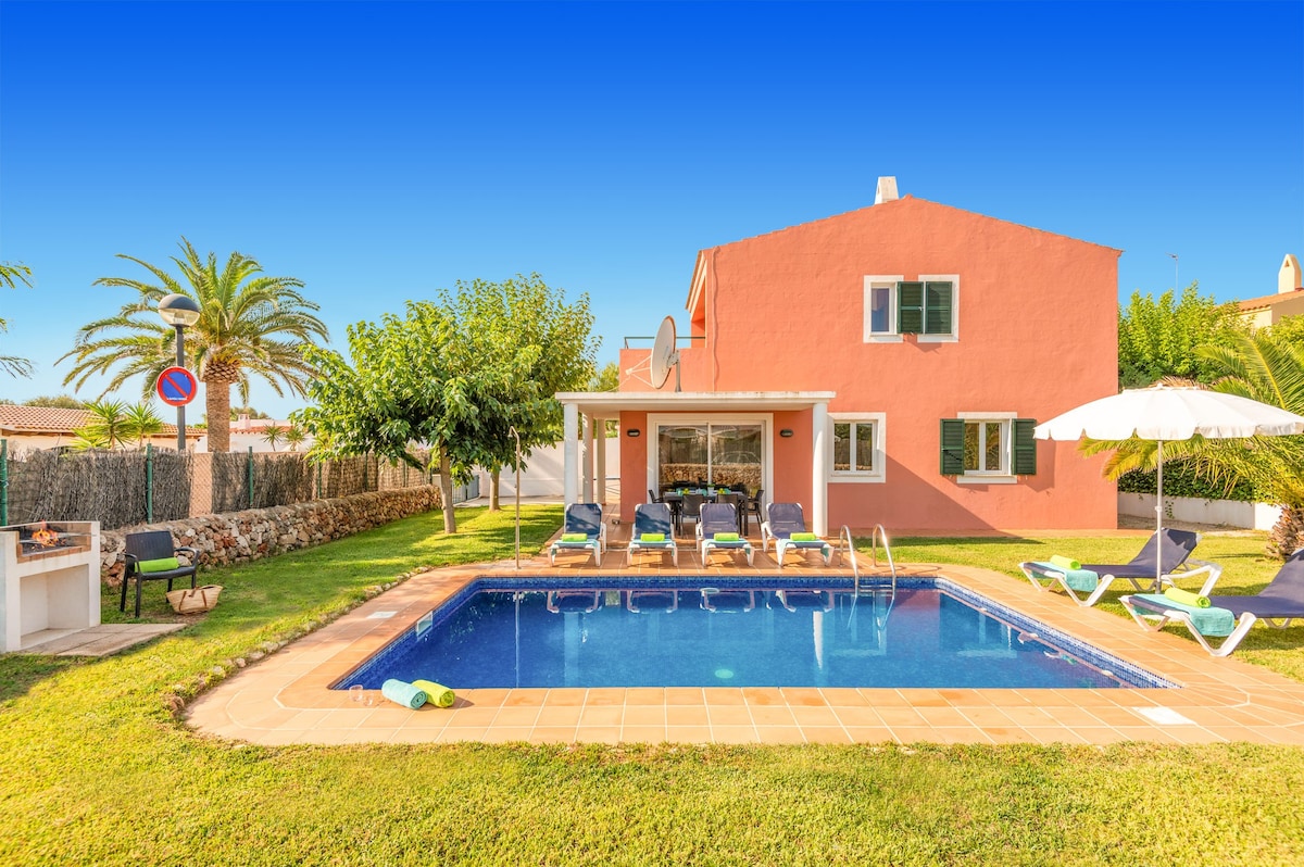 Villas Nura (2 Villas) Preciosas Villas, con Piscina, BBQ, y amplio jardín, terraza cubierta, con un área exterior totalmente cerrada y cercada perfecta para niños y privacidad total, con estacionamiento privado y cerrado para su automóvil. Con amplios espacios interiores en salón-comedor con tv por cable, wifi y aa.cc en todas las habitaciones y terraza en suite. A 300 metros del mar y la playa y a 3 km. del de la encantadora ciudad de Ciutadella