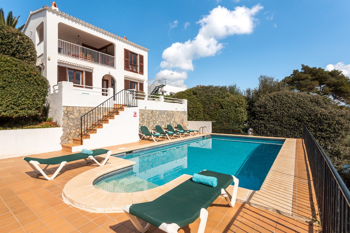 Villa única frente al mar con puesta de sol. Precioso jardin con gran piscina y barbaco de piedra. Muy equipada con tombonas y zona chill out. Terrraza preciosa con vistas al mar y a la bahia de Ciutadella. A 200m de la playa y 5km de la emblematica Ciutadella. Interior muy fresco y luminoso, con sala estar en piso superior con mesa comedor y vistas al mar, junto a una cocina muy comoda. En el piso inferior cuenta con cuatro habitaciones dobles con aire acondicionado.