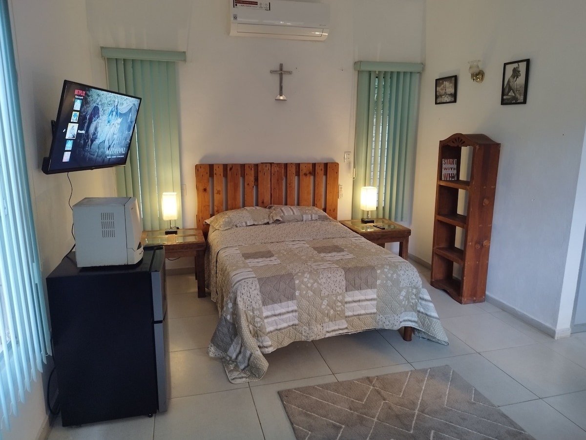 Departamento limpio, lugar tranquilo para dos huéspedes. Cuenta con TV, cocineta, minibar, microondas, olla eléctrica, cafetera, vajilla, vasos. Cómoda y amplia terraza compartida. A tan solo 20 minutos en camión a la Avenida Principal Paseo de Montejo, el camión pasa a 8 metros del departamento. También tiene cerca tienda de vivieres básicos OXXO a 5 minutos caminando y a 10 minutos caminando del super Soriana y a 15 minutos en camión la plaza comercial Altabrisa.