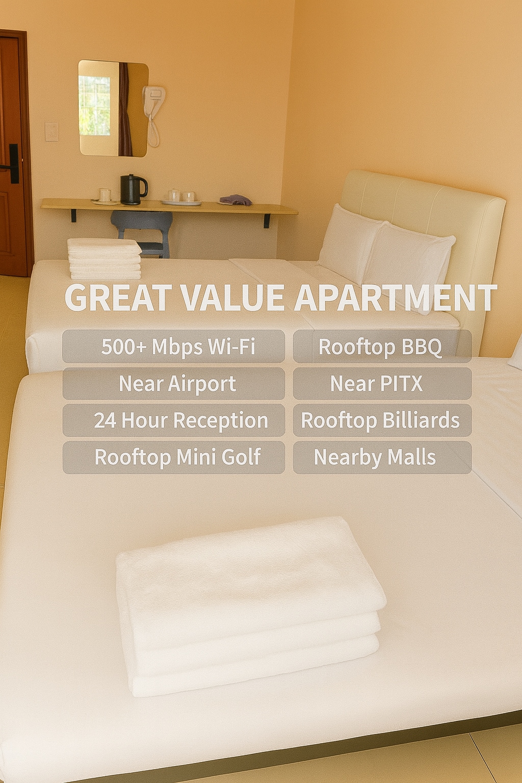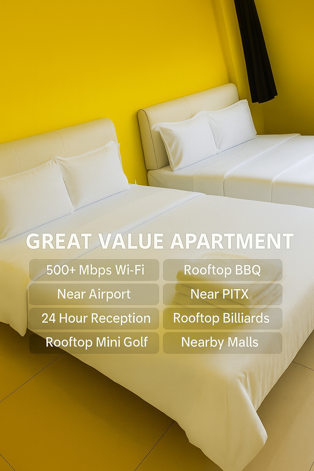 Standalone building with about 50 guest rooms, located very close to Manila Airport terminals. Surrounded by airline dorms and airport bus parking, it offers great convenience. The property features a private courtyard and 24/7 butler service, with 500+ Mbps high-speed internet throughout. Facilities include a rooftop billiard table, golf practice cage, BBQ area, and a small gym. Rooms are fully equipped with coffee, hair dryer, water heater, kettle, toiletries, plus shared kitchen and laundry.