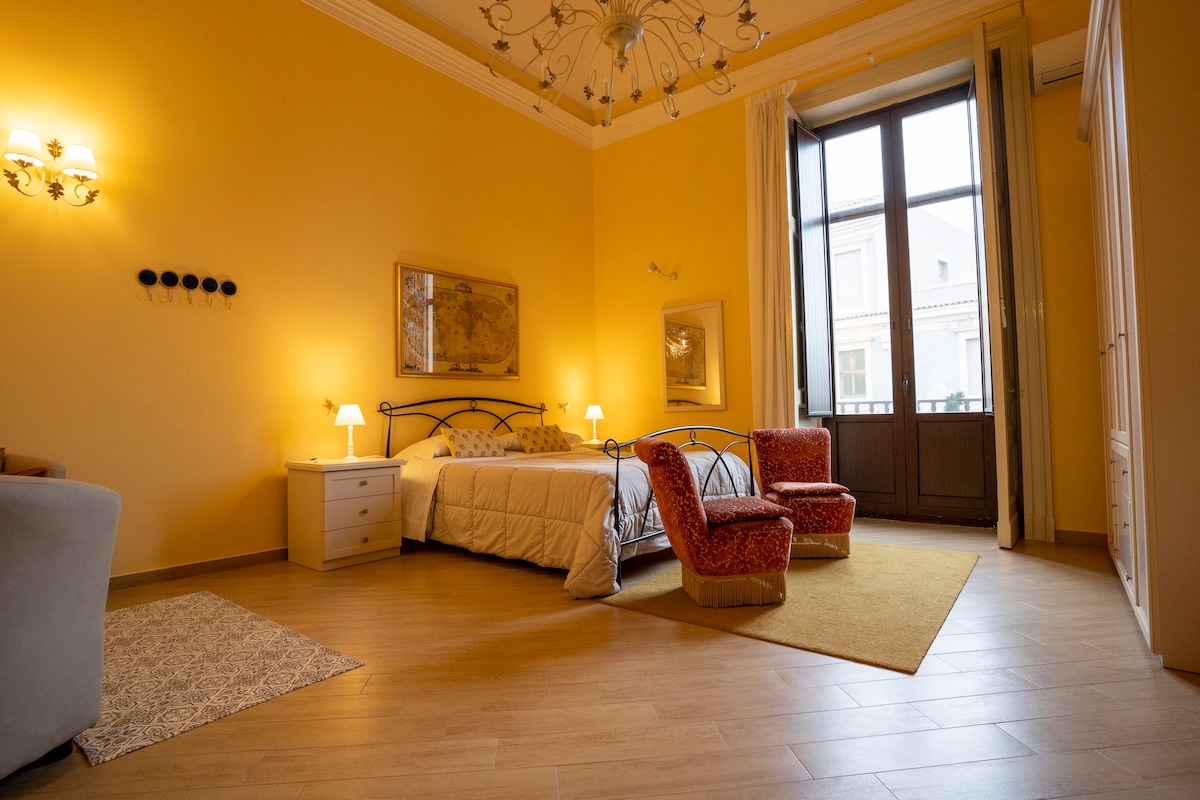 Enjoy a stylish holiday in this exclusive apartment in the historic centre, on the main floor of Palazzo Mannino: the ancient 5m high frescoed ceilings and the view on via Etnea make it unique. Active since May 2022 and now managed directly by the owner, it is located on the third floor without a lift. It consists of 2 double bedrooms (one with bed + sofa bed), 2 bathrooms, large kitchen, small terrace and laundry. From the balcony you can admire the beauty of the Etna volcano.