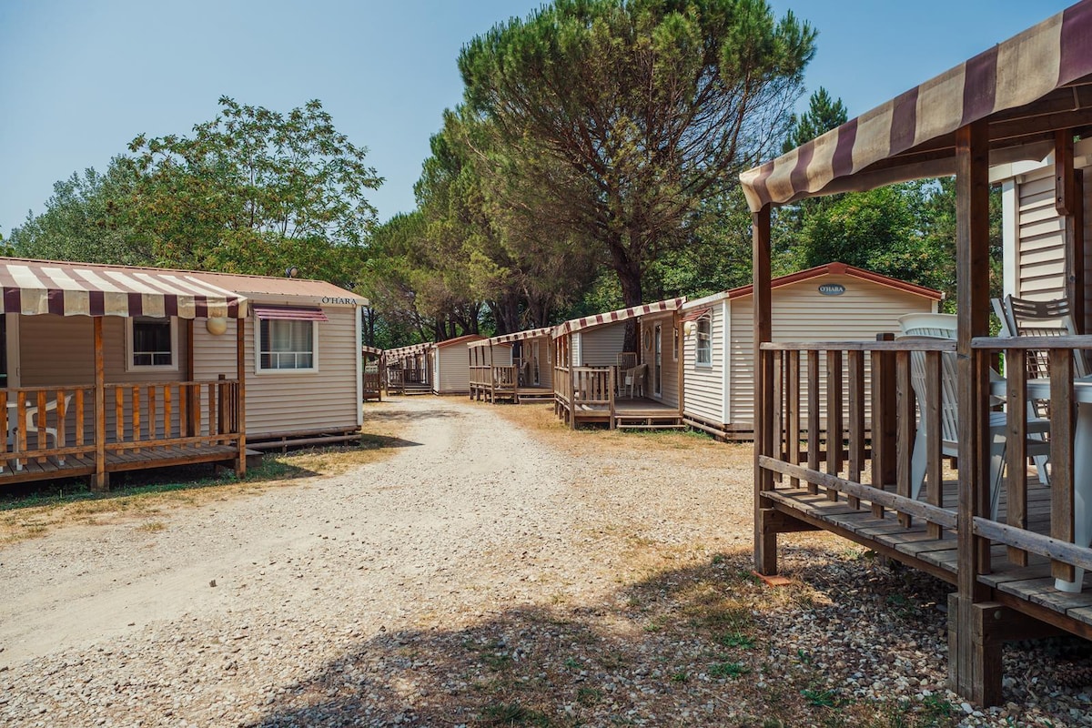 30 m² mobile home with a double bedroom and a bedroom with two single beds. Living area with sofa, TV, table and chairs, equipped kitchenette with dishes, utensils, microwave and fridge with freezer. Bathroom with shower, bidet, hairdryer and courtesy set. Includes air conditioning, heating and bed and bath linen (weekly change). Outdoor veranda that can be closed, with table, chairs and sun lounger. Parking. Pets welcome.