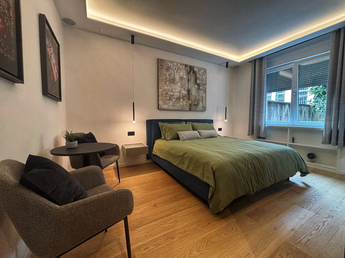 Elegant apartment, perfect for a comfortable and stylish stay. It features two bedrooms: a master with a canopy bed, infrared sauna, and en-suite bathroom, and another with two single beds, both with Smart TVs. Two bathrooms with spacious showers. A large living room with a sofa bed, 65” Smart TV, and dining table for six. Modern, fully equipped kitchen. Strategic location, just steps from the M1 metro (Amendola/Lotto), near CityLife, MiCo, and San Siro. Elegant, quiet, and well-served area.