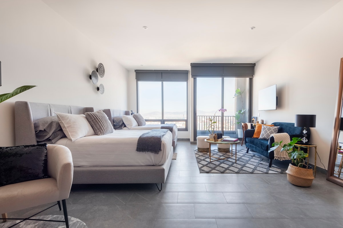 You’re about to discover your next stay! We’re thrilled to welcome you to our apartments. This building is not only in a prime location, but it also tells a story that celebrates contemporary Mexican art and culture. From handcrafted Talavera pieces made in Puebla to iconic quotes by renowned Mexican creatives like Octavio Paz and Alejandro González Iñárritu, every corner is designed to inspire you. Plus, you’ll get to enjoy one of the best views in the city.