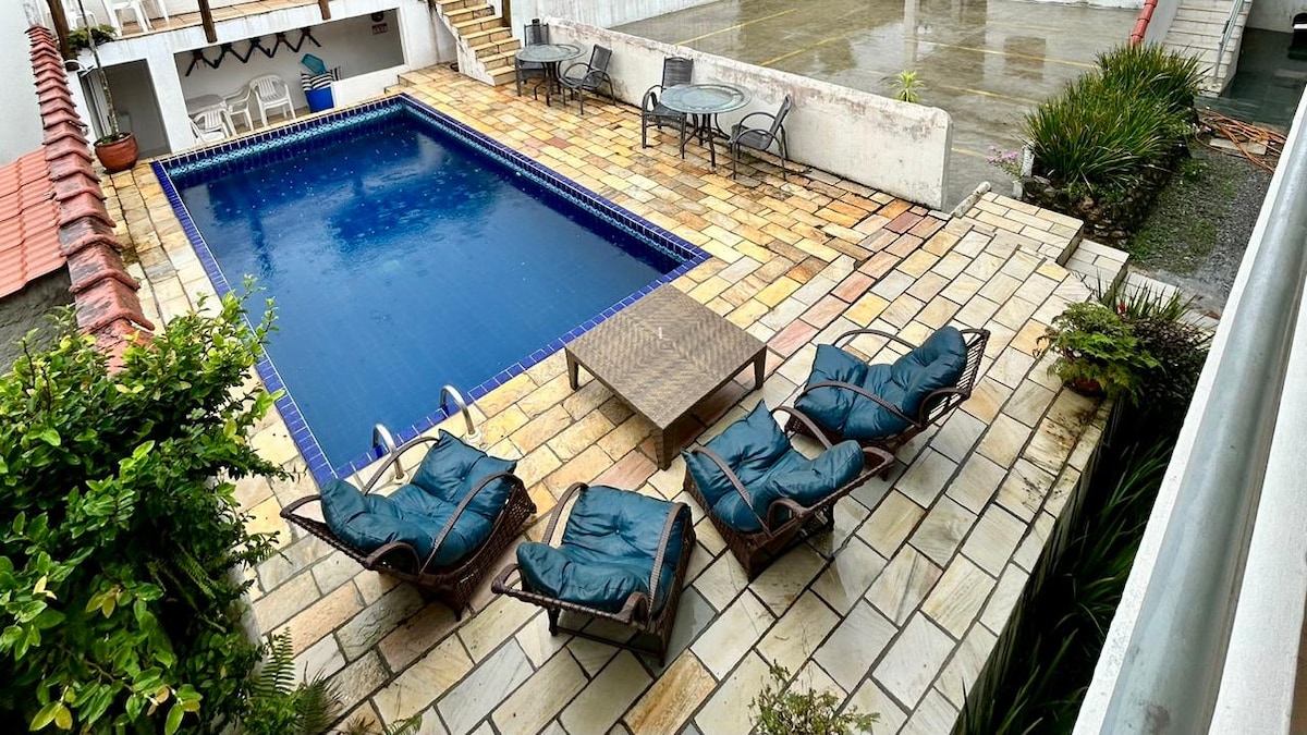Suíte (banheiro privativo) a poucos passos da praia, equipada com frigobar, ventilador, roupa de cama e banho (se solicitado), tv, wifi, água potável, ducha gelada direto da fonte e estacionamento no local Localizada em Trindade, bairro de Paraty. Somos a pousada mais perto da praia do meio (menos de 5 minutos), praia do caixadaço, piscina natural e cachoeira. Estamos bem próximos a rua principal (centro) . Ambiente familiar, com muita área verde, ideal para o descanso e contato com a natureza