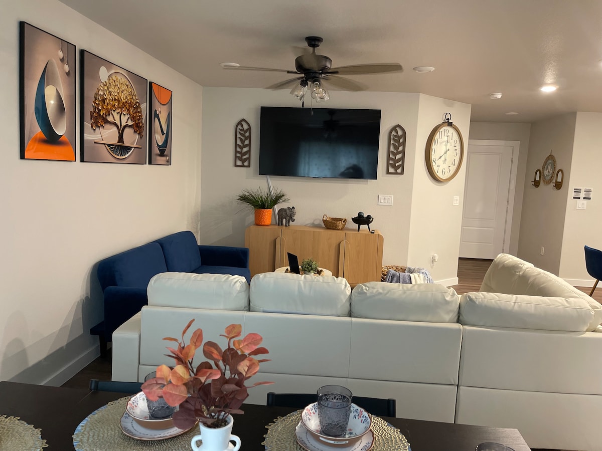 Terrific updated Newer home. Welcoming entry space into a very comfortable & stylish living area. OPEN plan: Living, Dining, & kitchen w/High ceilings, White Led Lighting, Smart 50" TV in the living room. Sequestered Owners Retreat, double closets, Soaking tub, separate shower. SUPER FAST 1G WIFI! Pots/ pans, Full Dish Set, Glasses, Iron, Toiletries, & complimentary snacks. UPDATES AS OF 2024 - New washer /dryer, dishwasher, interior paint, lighting, smart TVs in all bedrooms. GRILL REMOVED