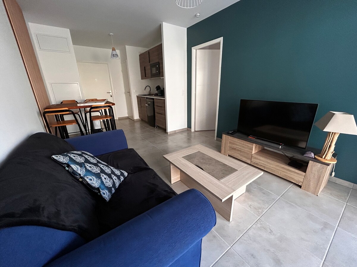 Appartement de 35 m2 à 300 mètres de la plage principale au calme + balcon de 9 m2 exposé Sud + local à vélos. Au pied de l 'océan, des forêts, des pistes cyclabes et des commerces …. Place de parking privée. Chambre séparée du salon par un rideau comprenant 1 lit double. Salon ouvert sur le coin cuisine toute équipée avec un canapé lit, Tv , ventilateur, penderie. WC séparé, salle de bain avec baignoire équipée d'une machine à laver. Balcon avec table et chaises. WIFI inclu