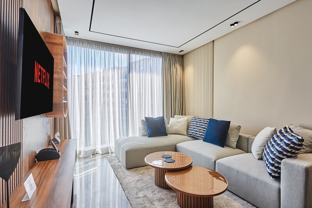 Stylish 54m² apartment + 38m² private patio in non-overlooked area of Les Princesses. Bright living room with 65" Smart TV (Netflix), fast Wi-Fi. King-size 180 bed with blackout curtains. Fully equipped kitchen: island, oven, gas hob, Nespresso, kettle. Marble bathroom with walk-in shower. Includes hair dryer, iron, central A/C & heating. Private parking with elevator access. 24/7 self check-in. Perfect for business trips or couples. A DAR & STAY signature experience.
