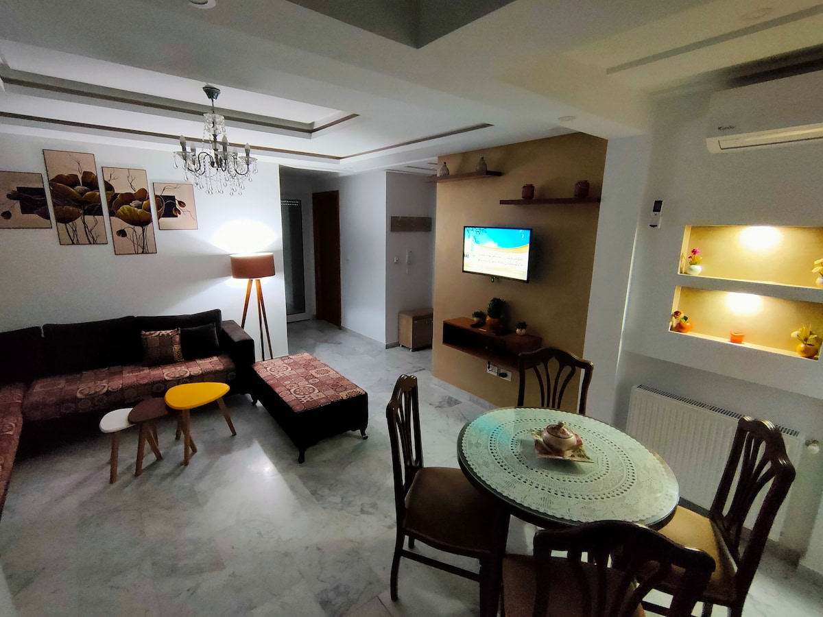 Appartement chic au rez de chaussé bien sécurisé (code d'entrée, caméras de surveillances ) richement meublé avec un magnifique espace en pleni air à la falaise de Monastir près de la mer et du complexe touristique La Marina à 3 minutes à pieds dans un endrois calme près des restaurants et cafés en plein centre ville à deux pas des magasins artisanales, marché central, et monuments historiques (mosolet de Bourguiba) ...