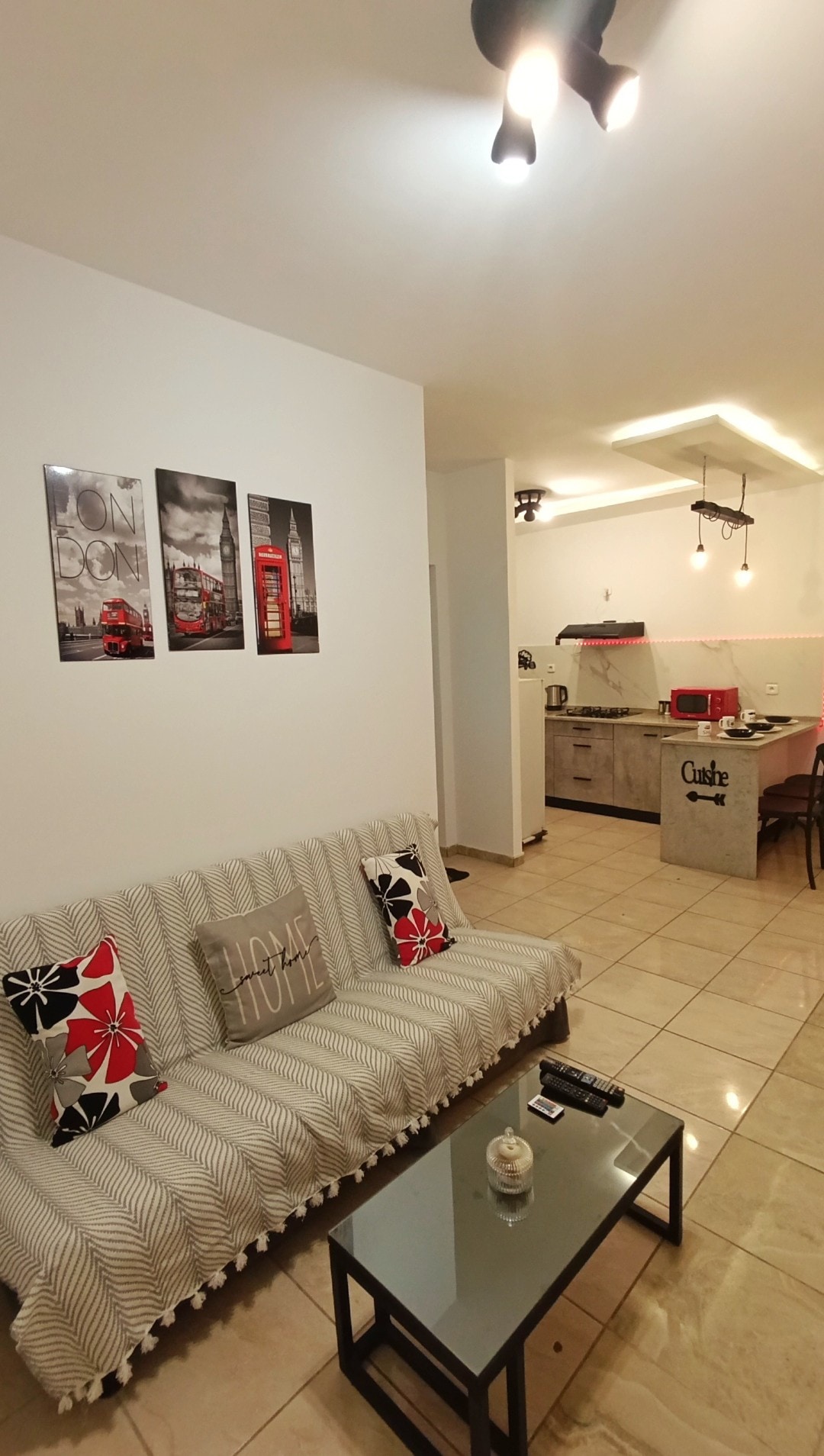 Appartement lumineux et bien aéré à Monastir, idéalement situé dans un quartier central, proche des transports et lieux d’intérêt. Commerces, cafés et épicerie juste en dessous. Vous serez bien entouré, car nous habitons dans la même immeuble et restons disponibles en cas de besoin. Chambre parentale (lit king size 2/2m) avec balcon, petite chambre avec lit simple, salon cosy et cuisine équipée. WiFi, climatisation dans la chambre parentale et stationnement gratuit devant la résidence.