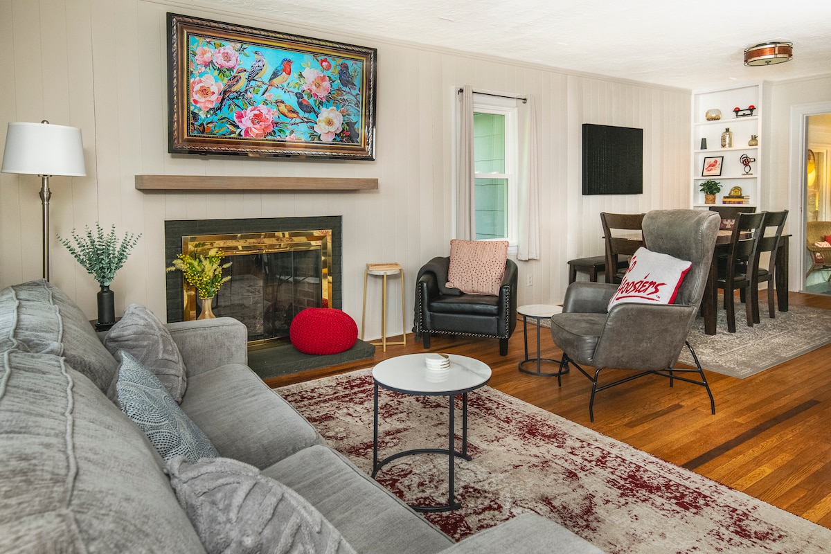 Escape to 'Hoosier Haven,' your perfect Bloomington retreat just a 3-minute walk from Indiana University! This spacious home comfortably fits groups with 3 king bedrooms. Enjoy a private fenced backyard with a BBQ, a fully equipped kitchen, and a dedicated 'Hoosier Lounge' sunroom. Ideal for family getaways, alumni weekends, and exploring downtown Bloomington. Walk everywhere from this prime location!