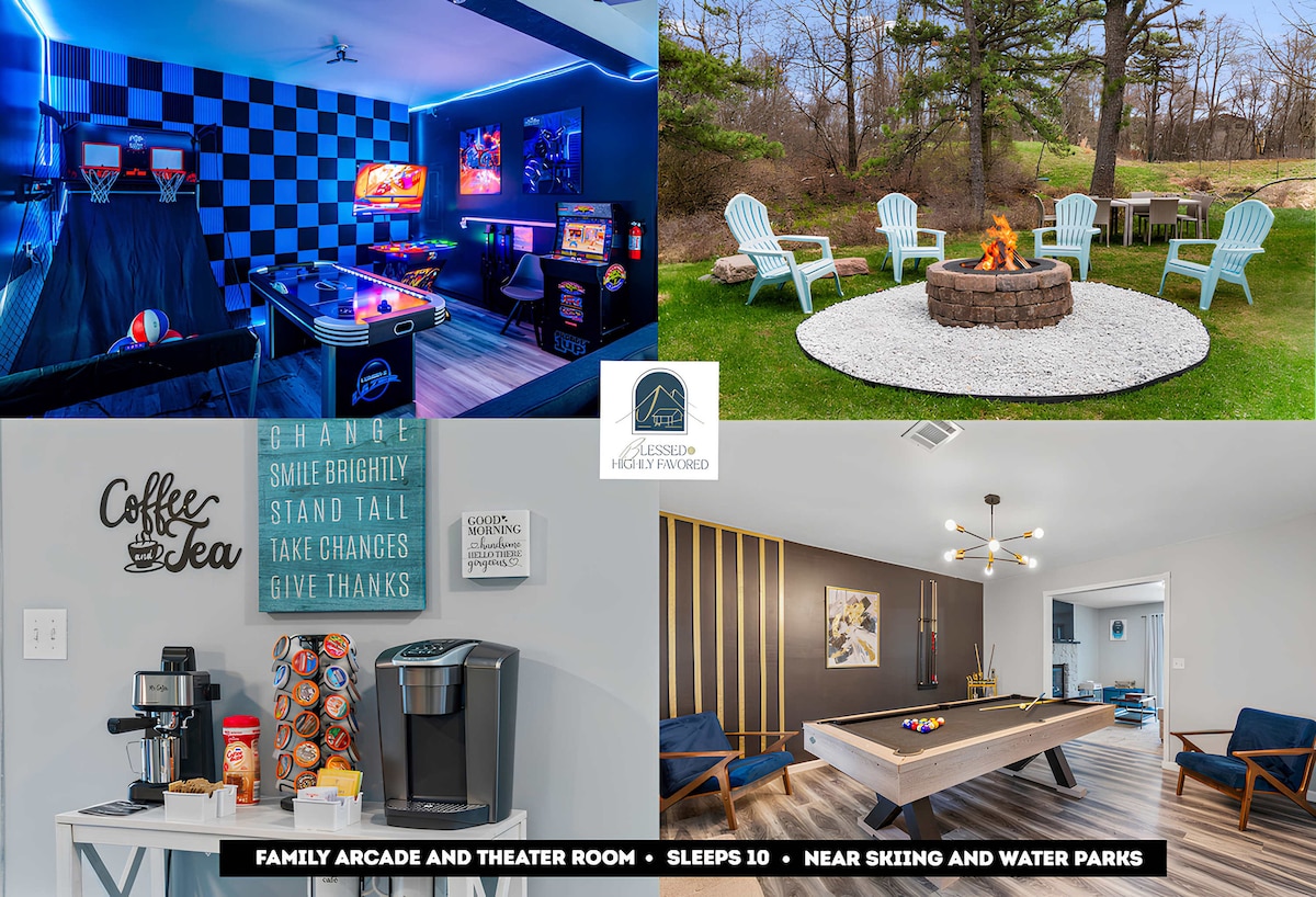 We would love to host you and your loved ones on your vacation to the Poconos at the Hummingbird Home! We take pride in providing our guests with top notch hospitality along with a beautiful home packed with amenities including a movie theater, a huge dedicated game room, 2 fireplaces, a fire-table, fire pit, hot tub and a barrel sauna. Close to golf courses, ski resorts, lake, indoor water parks, beach and trails at Hickory Run State Park, and plenty of bars and restaurants. 🏖️🎥⛳🏂🏀