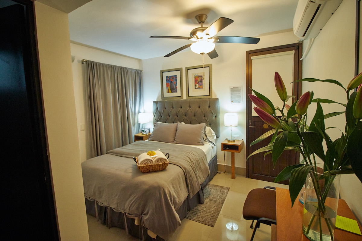 Cozy private room with bathroom and independent entrance, just one block from Hospital Universitario. Equipped with A/C, microwave, and mini-fridge. Strategic location: Galerías and Doctors Hospital 5 min away, San Pedro 10 min, and Downtown 15 min. Walking distance to convenience stores, pharmacies, and restaurants. Ideal for medical visits or work stays.