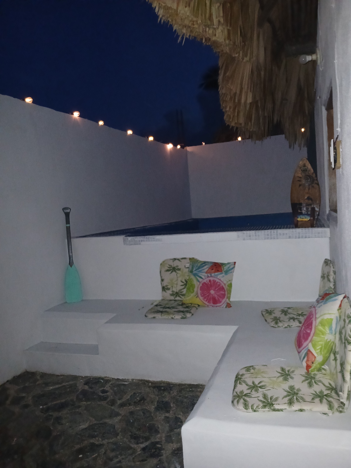 This is a studio apartment in the first luxury apartment complex in El Paredón. It comes with kitchen, bathroom, and private terrace. The complex is built for security and privacy and has Starlink with 4 routers. The second floor has a unique pool with swim up bar and BBQ area. The 4th floor offers a community sundeck for yoga, massage or private sunbathing. The 1st floor has a full AC gym, a billard room with a home theater and a parking area. There is also a covered sport court with lights.