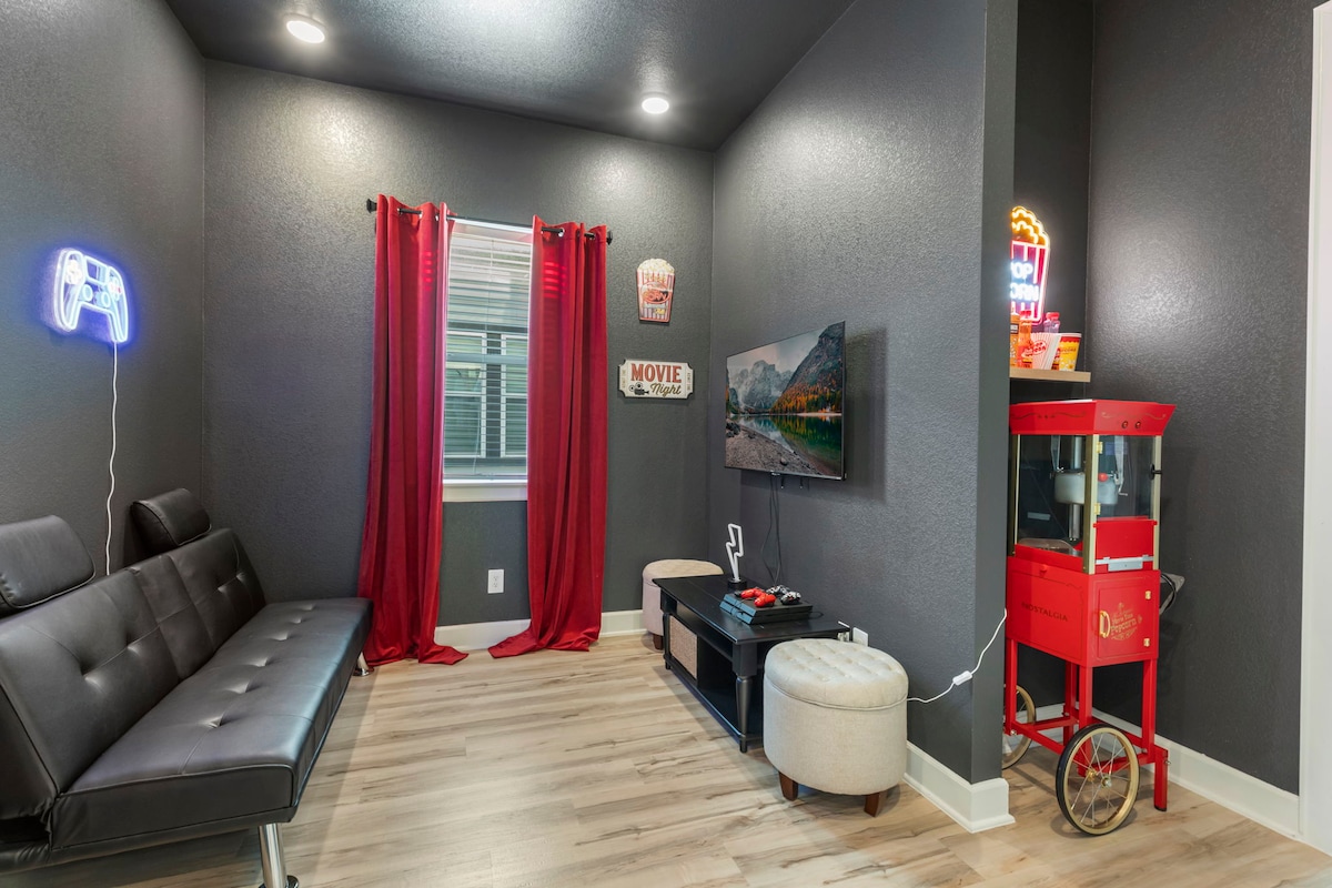 Welcome Home, The Woodlands Retreat Getaway! Enjoy your private Theater, 3 Luxury Suites and only minutes from The Woodlands’ top venues, parks, and medical centers. Open concept living space with quartzite countertops, a waterfall island, and stainless steel appliances. Close to The Cynthia Woods Mitchell Pavilion, Market Street, and scenic spots like Lake Woodlands and George Mitchell Nature Preserve, our home offers the convenience and tranquility in a family-friendly, nature-filled setting.