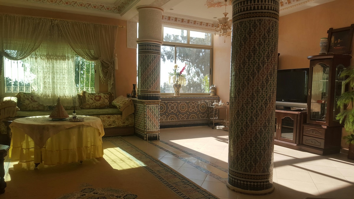Large (220m2) villa, designed by famous archtect Charles Boccarra. Private garden with heated pool. The villa is situated within a secured residence, with tennis court, Anadalou gardens, club house, .. A maid is on site to take care of all house hold tasks (beds, cleaning,...) Possibility of cooking. The villa is situated at 14 km from the center of Marrakech, and only 5 km from Royal Golf Club and Amelkis Golf.