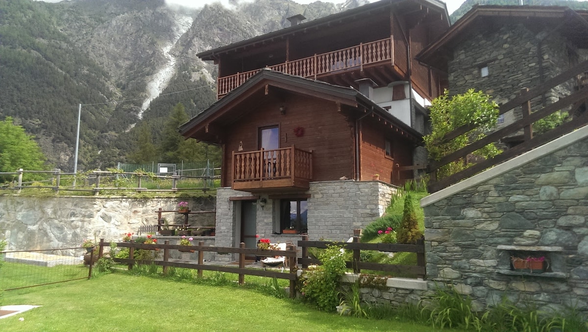 Alps Mountains. Italy. Aosta Valley. A cabin in a small village at 1600 meters,in the peace of meadows, grazing cows and mountains. Snow (usually) in the winter. A place of the heart, lovingly restored preserving the ancient beams of the roof. A wonderful view from the large windows and a special tranquility for those in search of peace, warmth and relaxation. The furniture is very nice: wood above all, but also more lively colors, and modern comforts. Quiet excursions, both on snowshoes or ski.