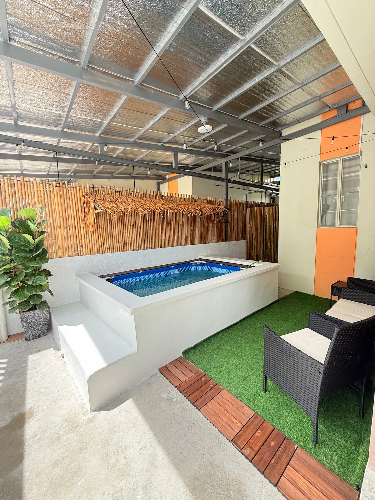 Experience luxury at our new pool villa in The Strand, Nagbalayong, Morong, Bataan. Blending modern Filipino design with traditional charm, enjoy direct pool access, a rainshower, and lush surroundings. Just 3 minutes from the beach, the villa accommodates 10 adults in three bedrooms. Modern conveniences include fully airconditioned rooms, all with toilet and bath, Wi-Fi, a smart TV, and a fully-equipped kitchen. Book now for a uniquely Filipino-designed escape.