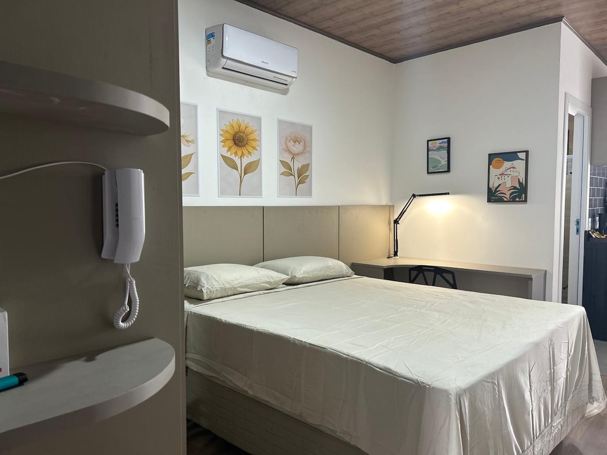 Apart Hotel completo, na localização mais privilegiada da Praia do Canto, em frente ao mar e à praça dos namorados. A poucos passos da badalada região do Triângulo das Bermudas e de todas as facilidades possíveis, como padarias, mercados, farmácias, além dos melhores bares e restaurantes do bairro mais nobre do Espírito Santo. O apartamento conta com quarto, sala e cozinha integrados, além de um banheiro e uma varanda com vista mar. A cama é tamanho queen.