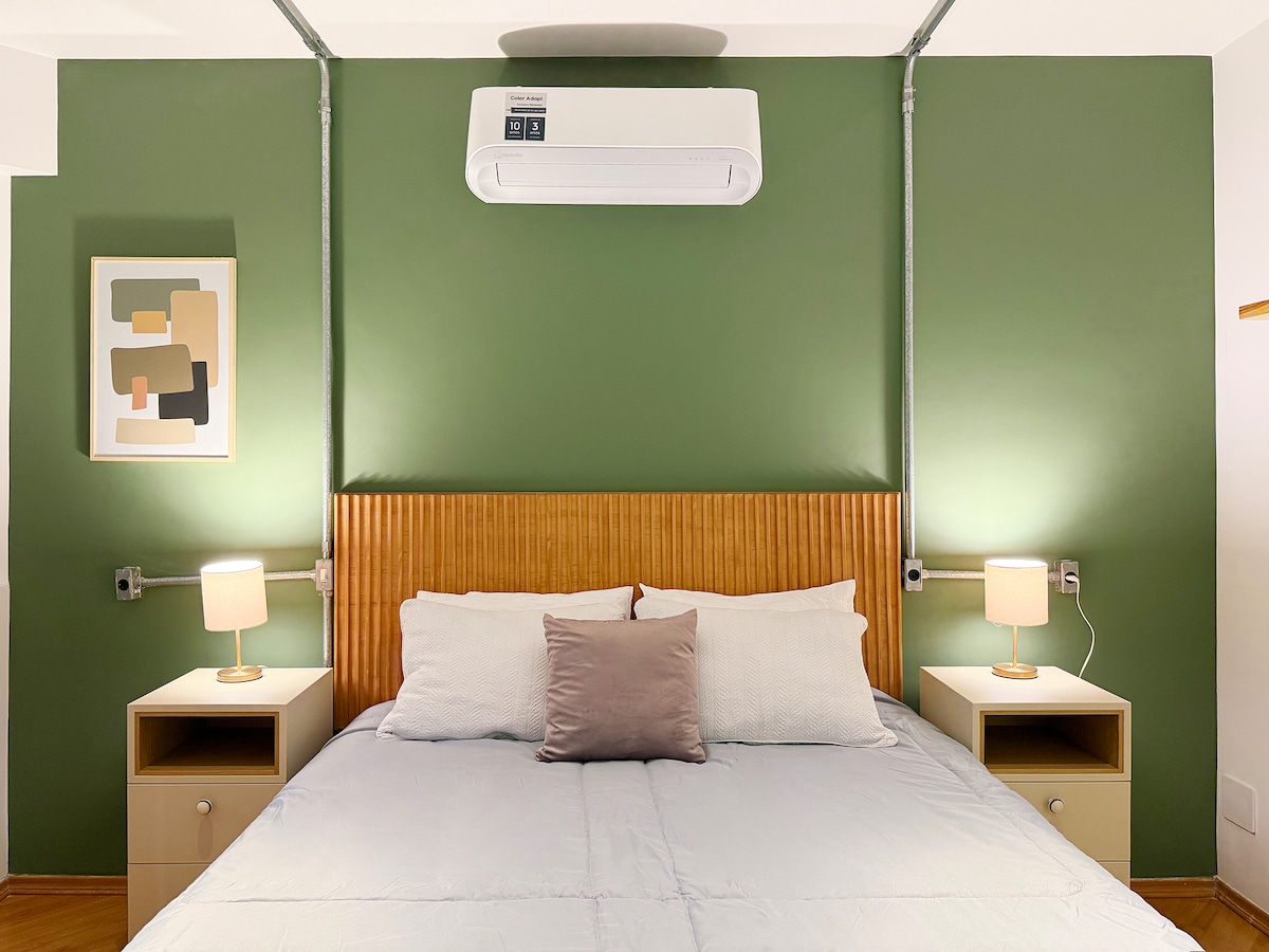 Stylish 50 m² apt. located at Bela Vista, has 24hr doorman. 2 bedrooms (only 1 with AC, and queen bed, the second one is quite small and can be used as an office, fitting a double-sized sofa-bed) and 1 bathroom. With amazing views from every window, it is a great place to work and relax. The private jet-tube at the balcony is a fantastic spot to enjoy the city views. Ideal for couples, professionals or small families looking for comfort, convenience, and one of the best views in the city.