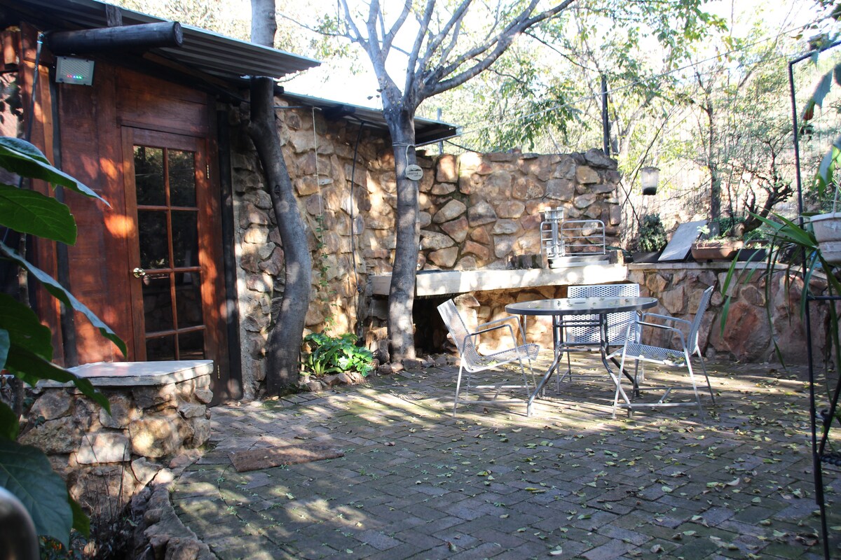 Enjoy a peaceful moment in nature under the large white stinkwood trees and spot the resident sunbirds and mocking chats. The Cave is a stone room featuring a double bed, kitchenette, en-suite bathroom and outdoor seating area to braai and relax. The ideal place for a romantic weekend away while attending a wedding at a nearby venue, or just to get away from it all without travelling too far. Pretoria East and the nearest shops are just 10 minutes away.