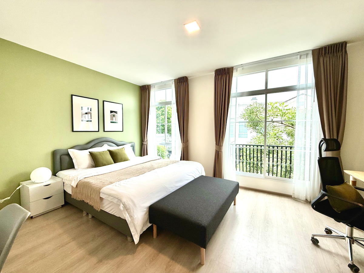 This townhome offers ample space, perfect for families and friends. Surrounded by greenery, a backyard BBQ area and the bohemian-style living room adds to its charm. Conveniently located near BTS stations, it also offers parking for two cars. A convenience store is right in front of the house, while a night market, malls, and restaurants are nearby. Easily access the coastal area via Sukhumvit Road or expressway. It's also a convenient stop before heading to Suvarnabhumi Airport.