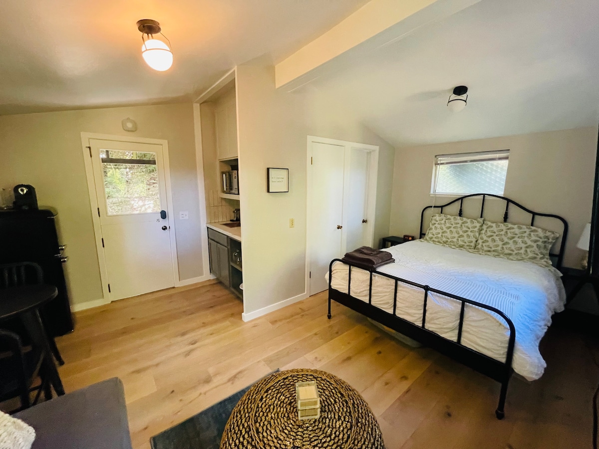 Discover the open flow of this homey artsy private studio. Enjoy floor-to-ceiling valley views. Curl up in a daylight flooded reading nook. Perched at the top of the historic Dipsea Steps, the apartment is a short walk from Mill Valley’s enchanting boutiques, restaurants, and coffee shops. Jump on trails and hike the Headlands, Muir Woods, and Stinson Beach. The studio has a kitchenette with a mini fridge, Nespresso machine and a microwave. Please note, it’s definitely not for cooking meals.