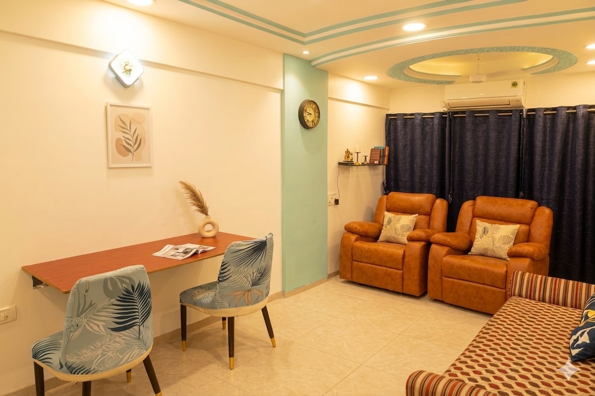 A beautiful, 2BHK apartment near Nesco, A welcoming feel with a comfortable 3-seater sofa with two puffy chairs, A large 55-inch TV ready for your entertainment needs, Three AC (one in the living room and one in each bedroom) Two well-appointed bedrooms, each with its own attached washroom for maximum privacy and convenience. A fully equipped kitchen with everything you need to cook at home, including essential utensils, a modern oven, an induction stove, a fridge, and a washing machine.