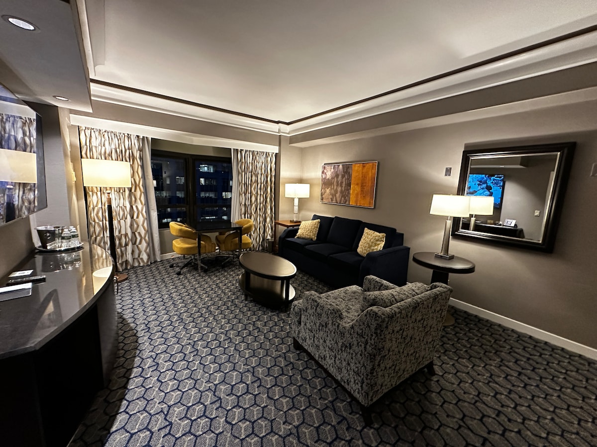 720 to 845 Square Feet Located on the 8th floor in Apartment Hotel. Comfortable King Size Bed. Renovated marble-clad baths with glass enclosed walk-in shower featuring luxurious bath amenities. Brand new gourmet kitchens with quartz countertops, marble flooring, stainless steel appliances featuring a full-fridge or half-fridge, and a full complement of upscale kitchen accessories. Expansive living room with sofa, comfortable chairs, and dining area w/hardwood flooring in living and dining area.