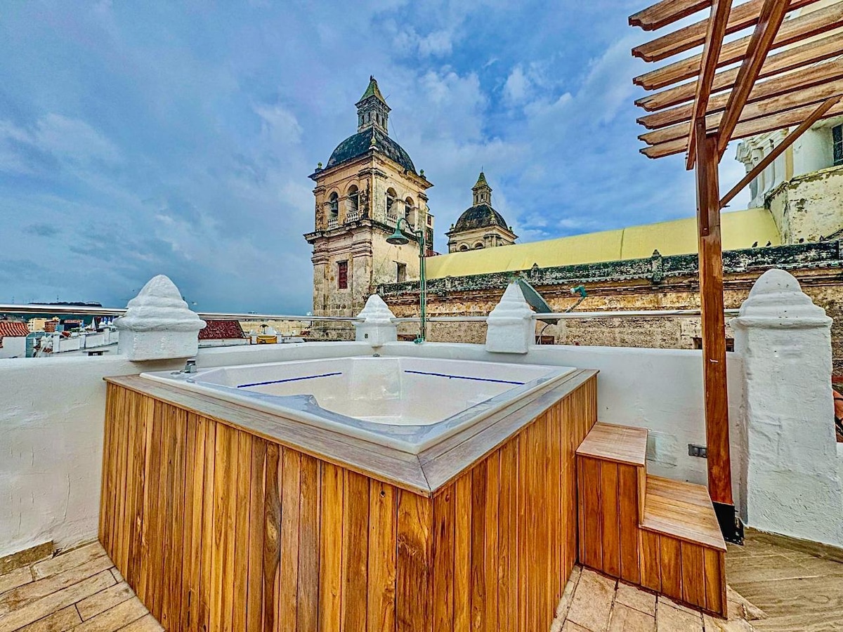 This stylish apt. is located in the heart of Getsemani. Amazing views from your private rooftop/terrace with a cool water jacuzzi to freshen up from the hot sun. Next to the best sights of the city center; restaurants, bars, squares. Perfect for small groups or families.