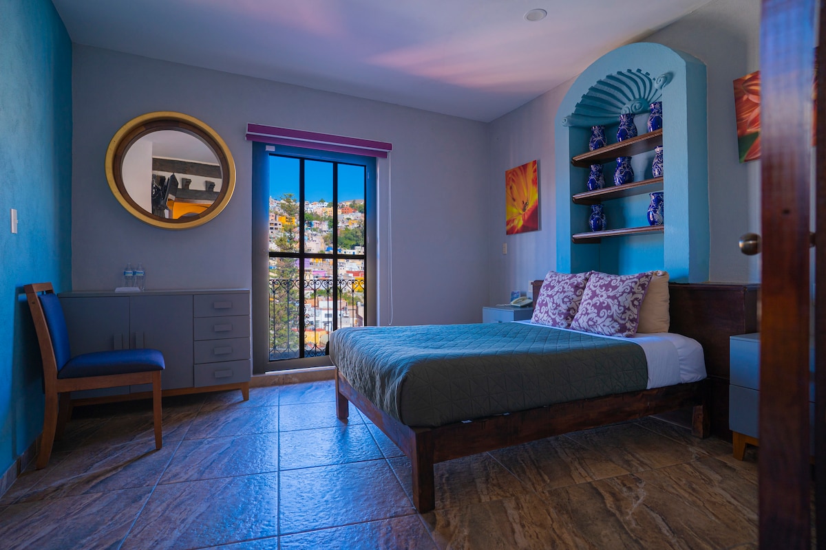 Perfectly located in the center of Guanajuato on historic and colorful Tecolote, a tranquil PEDESTRIAN street only a few minutes walk uphill from plentiful restaurants, bars, theaters and activities. This apartment offers incredible VIEWS, beautiful old world charm and modern conveniences. The balcony is right off a comfortable living/dining/kitchen area, a great space to hang out and relax. The separate bedroom has 2 closets and a bed comfortable enough to ensure you a fabulous nights rest.