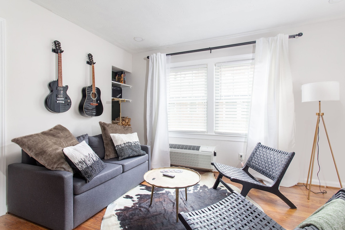 Song writers, artists, and visitors love this quiet apt surrounded by the rich history of Music Row.. EZ walk or cheap Uber to Downtown Nashville, neon lights of Broadway bars, Bridgestone, Ryman, Gulch, 12th S. REALLY close to Vandy, Belmont, Hillsboro Village. EZ drive or Uber to Nissan Stadium. Relax in the courtyard or enjoy some action on the putting greens or bocce ball court. Enjoy smart tv's, Keurig coffee, kitchenette. FREE BAG STORAGE, PARKING, & HATCH POSTER. Permit #2019015058
