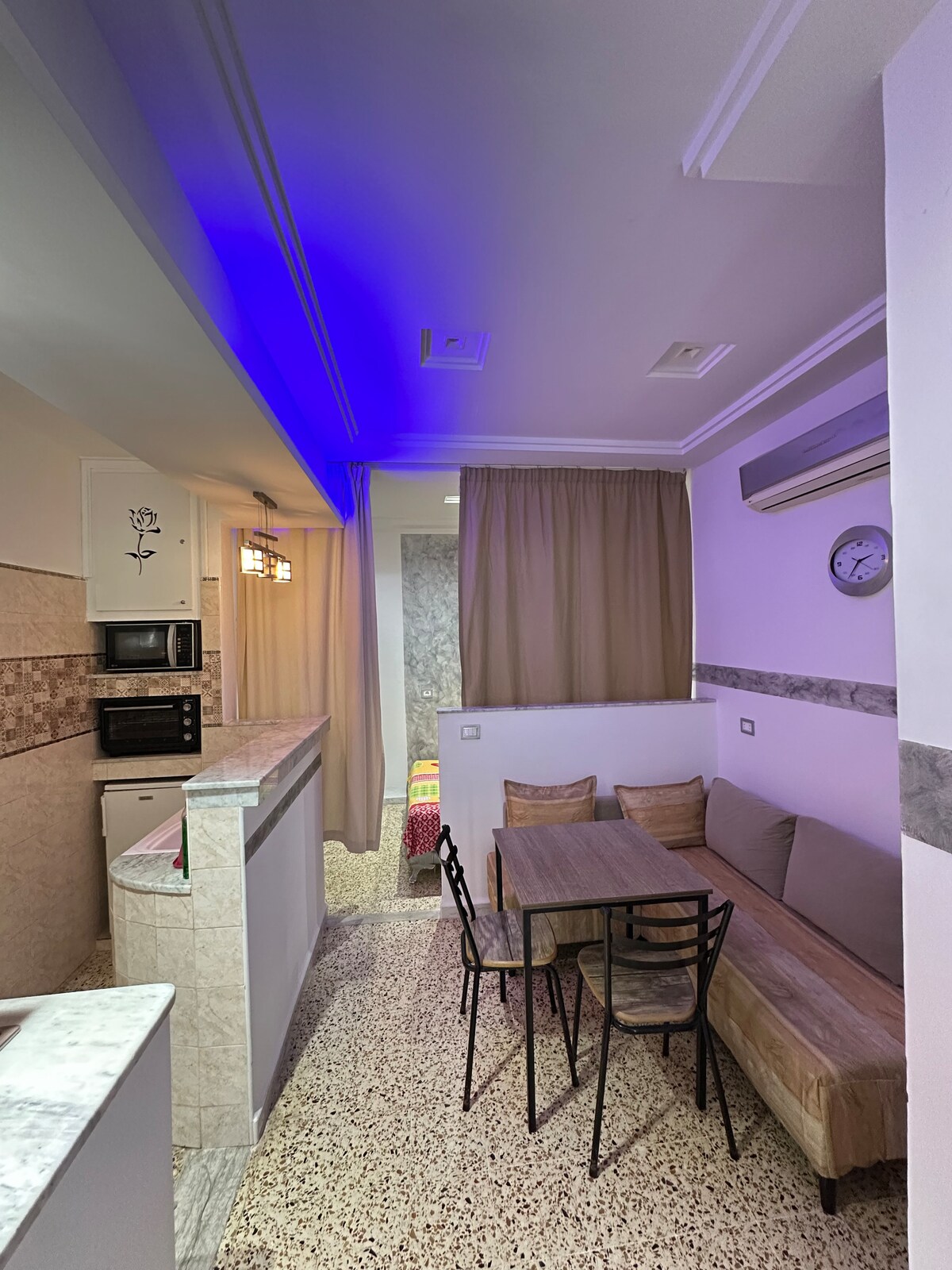 Détendez-vous dans ce studio calme et élégant avec une vue imprenable sur la mer de Maamoura. Idéal pour un séjour relaxant, il offre tout le confort nécessaire. *Chambre cosy : Lit confortable et mobilier raffiné. *Cuisine équipée : Tout le nécessaire pour cuisiner facilement. *Salon moderne : TV, WiFi et ampli pour une ambiance immersive. *Grande terrasse : Idéale pour admirer la vue, profiter d’un barbecue ou d’une soirée conviviale. Parfait pour un séjour en couple, en famille ou entre amis