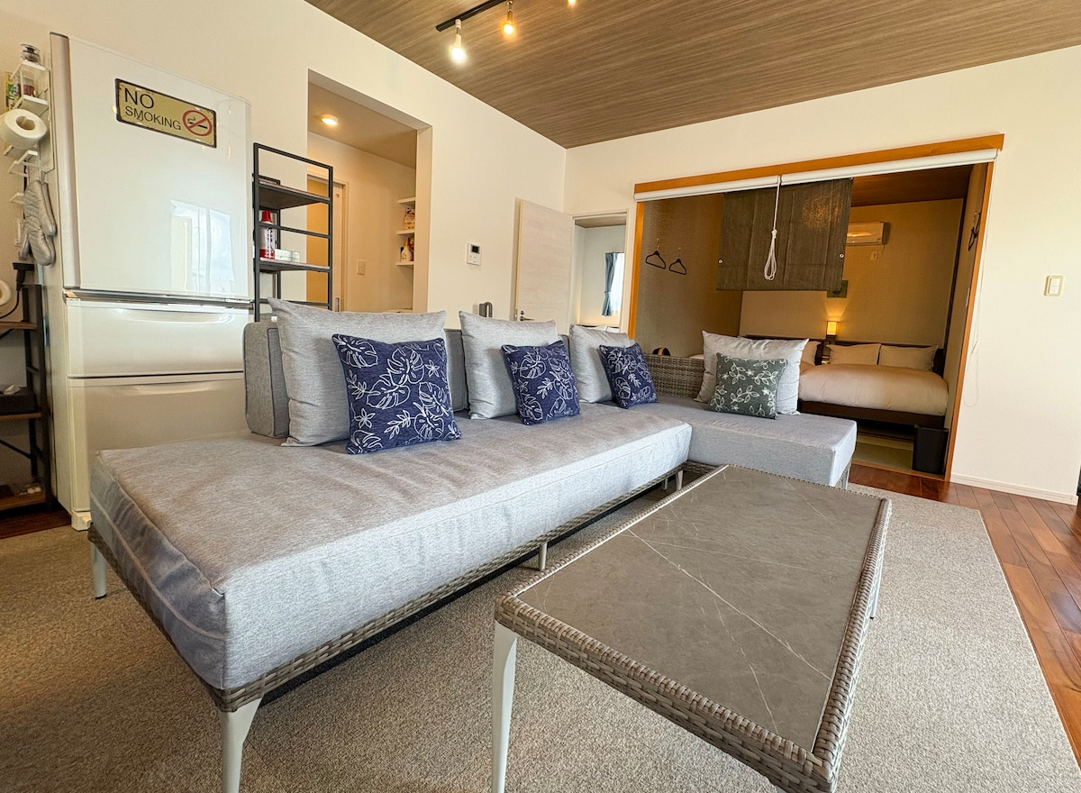 This Condominium is very new built in 2015 Apr. There are living space, kitchen,bathroom,landaury, bedroom and balcony.With 2beds and 3 Futons which use on Japanese Tatami. You would enjoy at beautful beach in front, also sunset from here.