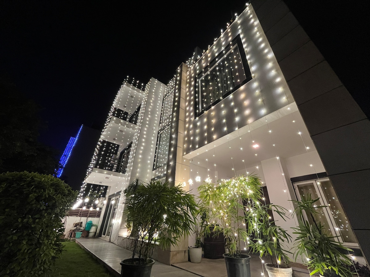 This spacious 3BHK Airbnb offers a perfect blend of modern comfort and style. The expansive living hall is ideal for relaxation while the sleek dining area ensures enjoyable meals. The kitchen makes cooking a breeze. The cozy garden provides a peaceful outdoor retreat. Unwind on the verandah or enjoy Netflix on the 65-inch LED TV. With ample space & thoughtful amenities, this contemporary home is perfect for families or groups seeking a stylish, convenient stay with a touch of luxury & comfort.
