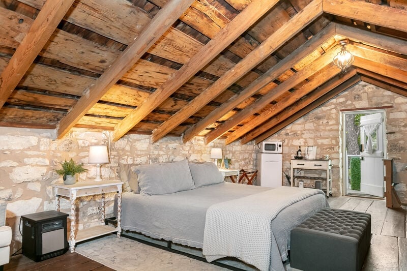 Baron's Creek Cabin is reminiscent of a cottage found in the French countryside. This quaint bungalow is perfect for a romantic getaway for two in wine country. Amble up the cobblestone path through the cabin’s front door to discover an interior reminiscent of a bygone era. Exposed rock walls and wood beam ceilings throughout add an authentic charm. Enjoy the cozy ambiance in the quaint sitting room, which features a warm fireplace (sesonal use). The rustic kitchen offers a mini fridge, microwav