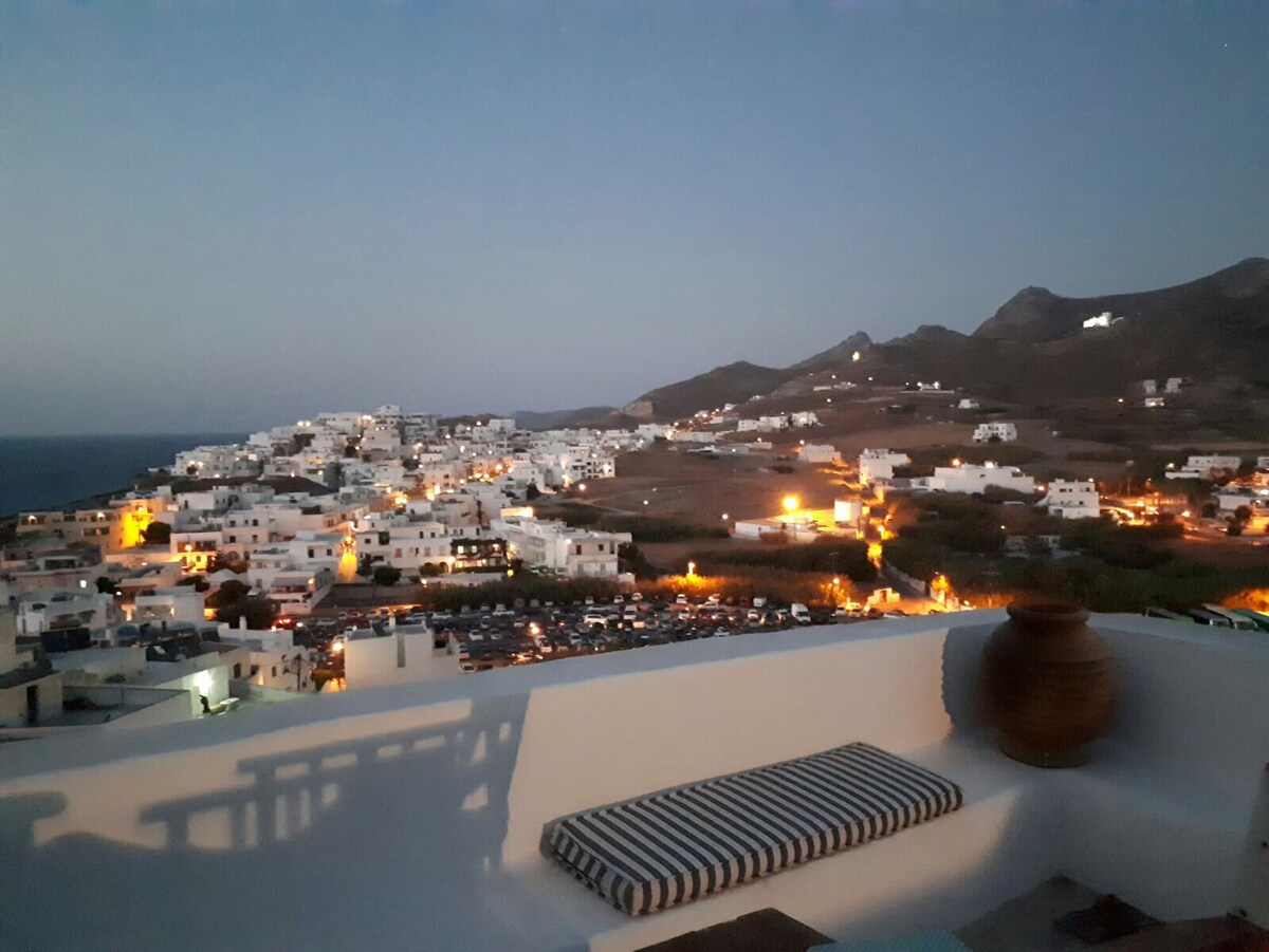 Modern Cycladic Designed and Comfortable House with incredible light and spectacular views located in a privileged environment with one bedroom and big terrace! The house is located 2km from Naxos town on the hill, overlooking Naxos Bay with a breathtaking view. This cozy house offers you everything for your holidays! The house is built on a huge rock and you have garden, a very big terrace with barbeque, pergolas, built sofas, and your own mini pool! Recommended from Conde Nast traveller!