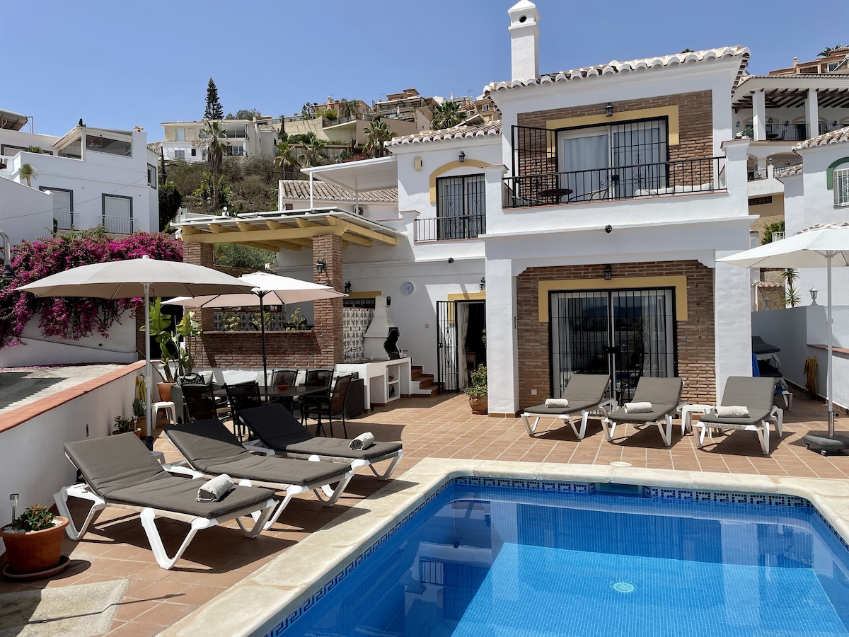Huset ligger i et villaområde, 2 km fra Nerja sentrum. Huset er orientert sydvestvendt med sol hele dagen og sen kveldsol. Nydelig utsikt mot olivenlund og havet. I første etasje er det et moderne kjøkken i åpen løsning til spisestue og stue, et dobbelt soverom og et bad. 2 etasje har 2 doble soverom, bad og takterrasse.Stor hage med overbygget spiseplass og lounge, basseng og grill. Aircon, wifi og tv /wifi speaker.