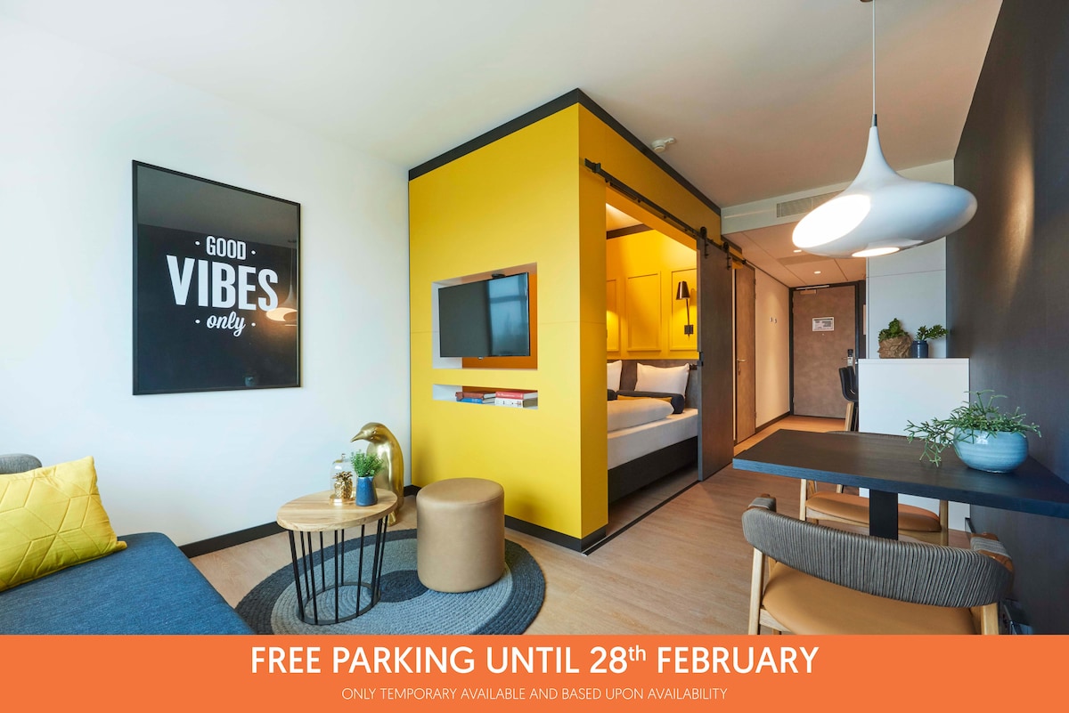 Spacious, artist-inspired suite for 2 guests with a comfortable king-size bed. Enjoy a private kitchen with induction hob, dishwasher, fridge, Nespresso, kettle, and cooking essentials. Air conditioning ensures a pleasant stay. Perfect for couples, solo travelers, or business trips, combining modern comfort with a creative, De Stijl-inspired atmosphere in the heart of the city.