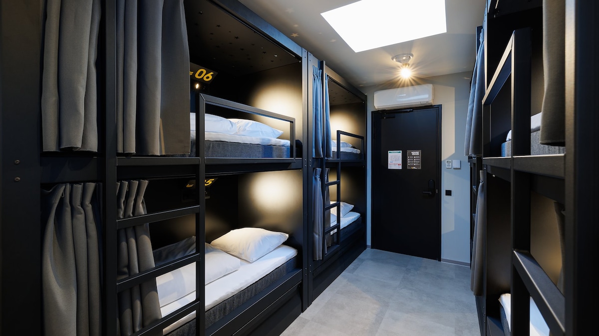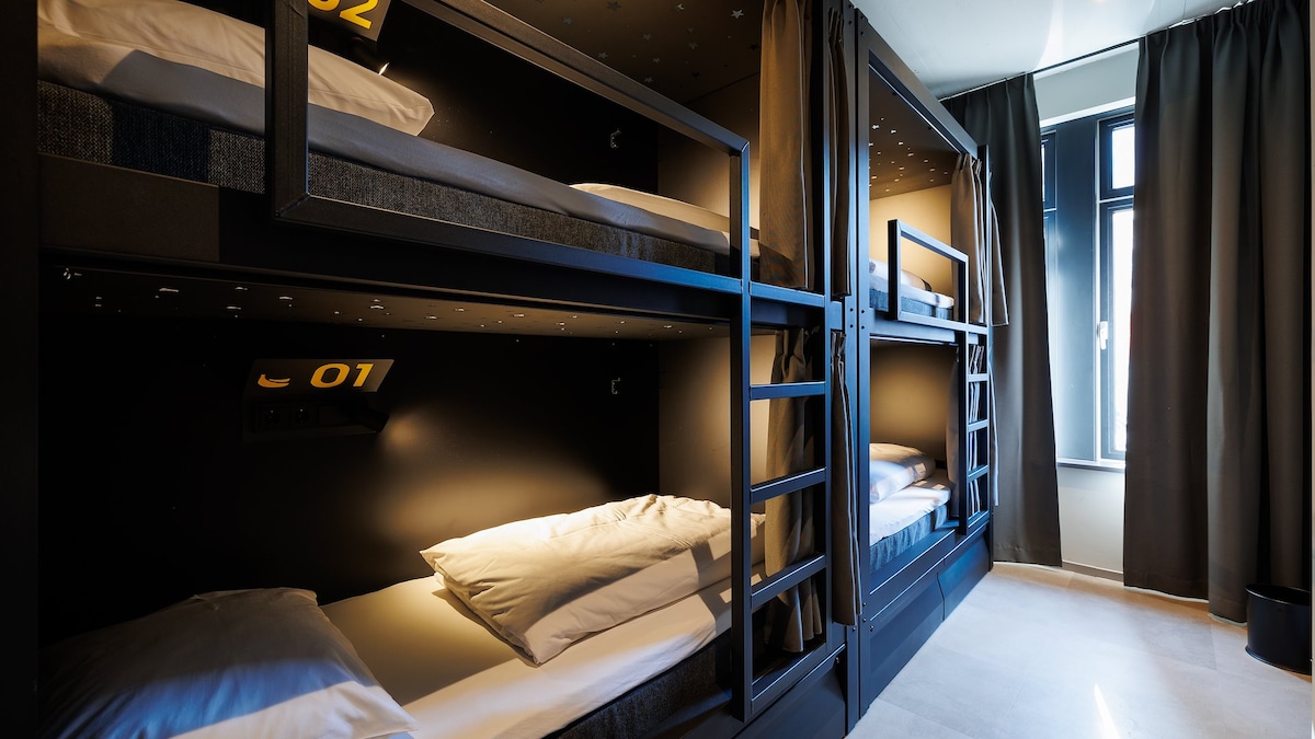 Book a bed in this mixed gender pod room. You can go all in and socialise with your fellow pod-neighbours, or close the curtain and stay completely private. The choice is yours! - Privacy blackout curtains - Own light, power outlets & locker - Phone/laptop shelf and coat hooks - Super comfy mattress - Bed made with cotton linen - Heating, AC & Co2 sensors - Towels available to rent Plenty of shared showers (separated for ladies and gents) are conveniently located outside the rooms.