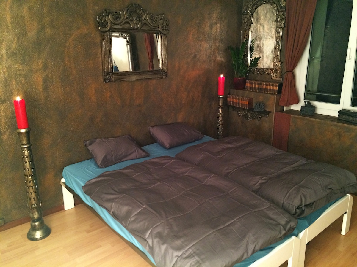 The cosy bedroom is located on the ground floor of our villa and offers a safe place to rest. While you are with us, you may use the outside features such as pool, fireplace, trampoline, parking space, terrace and garden. The inside spaces are all shared (bathrooms, shower, kitchen, living room, laundry room, etc.). Be aware that 3 children live in the house and it might get loud after school! We are however very respectful and love to meet new people. Breakfast avail. CHF 15.- p/pers.