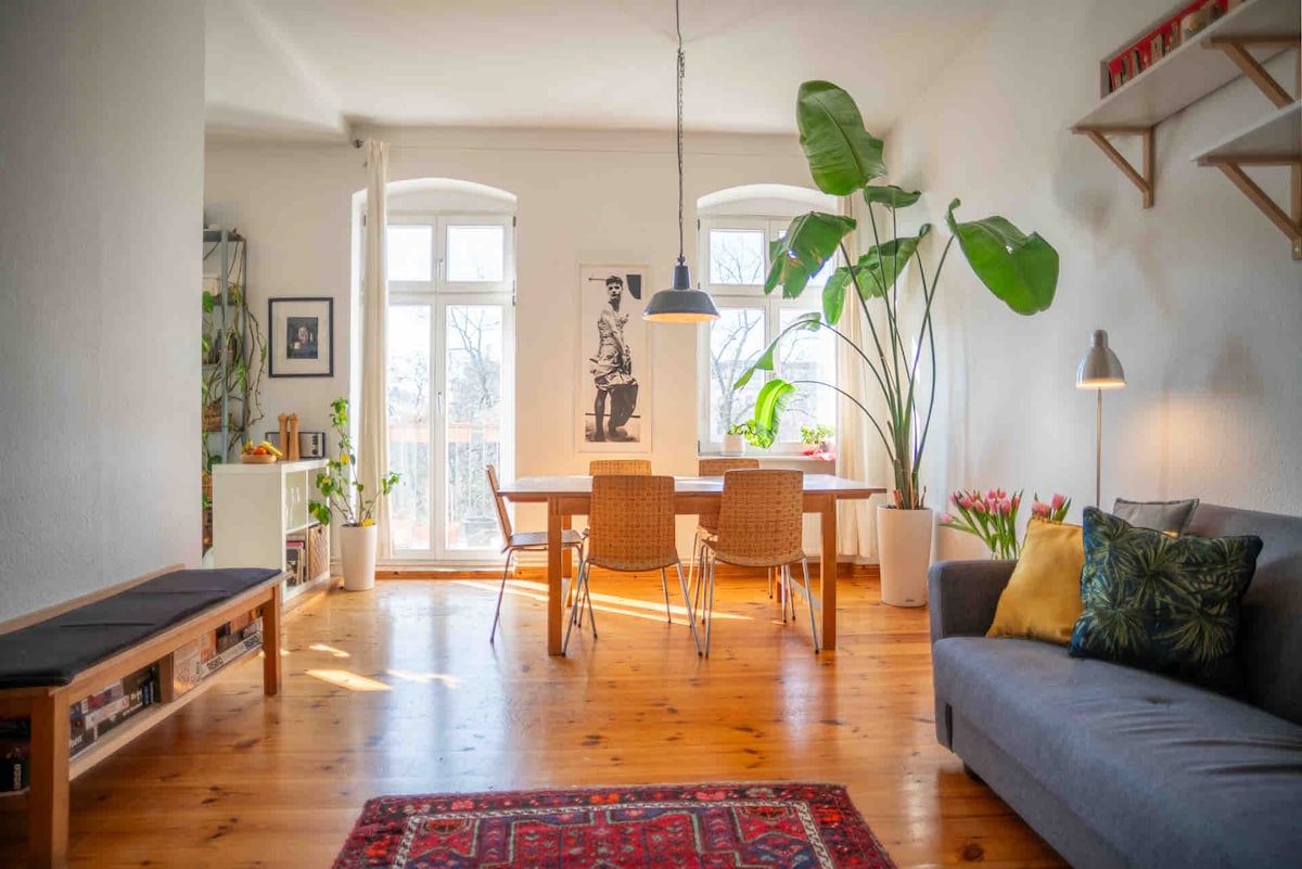 Perfect flat to visit Berlin as a couple. 1 beautiful quiet bedroom with view to the green backyard and 1,80x2m french bed, open living room - kitchen - dining area. Big bath room. Situated in trendy Prenzlauer Berg with shopping & dining areas nearby as well as beautiful parks and markets. 10min walking distance to Hackescher Markt / Alexander Platz, 10min bus ride to Brandenburger Tor. Serviced by professional cleaner before & after your stay. Coffee, tea, milk, oat milk, pasta paesto incl.