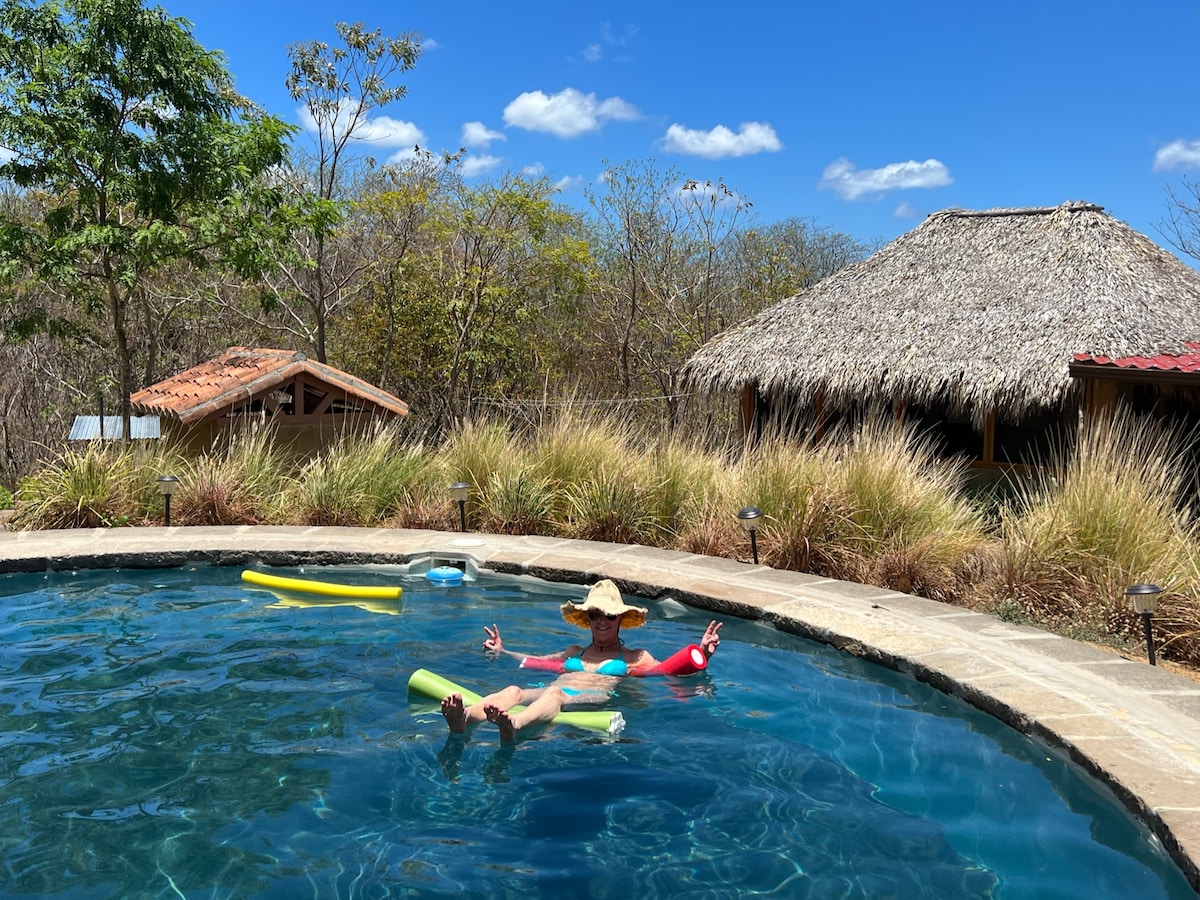 Tucked against the edge of the forest, the ranchito offers two very spacious three bed rooms with a shared bath and covered living space in between. Appointed with high quality furnishings made by local craftsman, a large shared pool and outdoor rancho kitchen, you will unwind and enjoy the peace and tranquility while still have the convenience of being only 15 minutes away from San Juan del Sur.