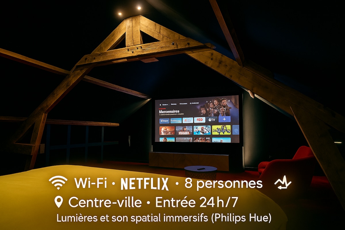 Profitez d'une véritable expérience de cinéma privé avec votre moitié ! Nous vous accueillons au coeur du Cambrésis, dans une maison individuelle entièrement rénovée où tout a été pensé pour que vous puissiez profiter d'une véritable séance sur grand écran pour découvrir ou redécouvrir les grands classiques, depuis un jacuzzi ! Ou profitez de vos films et séries préféré.e.s, entre amoureux, dans le confort d'un lit Queen Size. Plongez dans vos univers favoris et vivez une nuit magique !