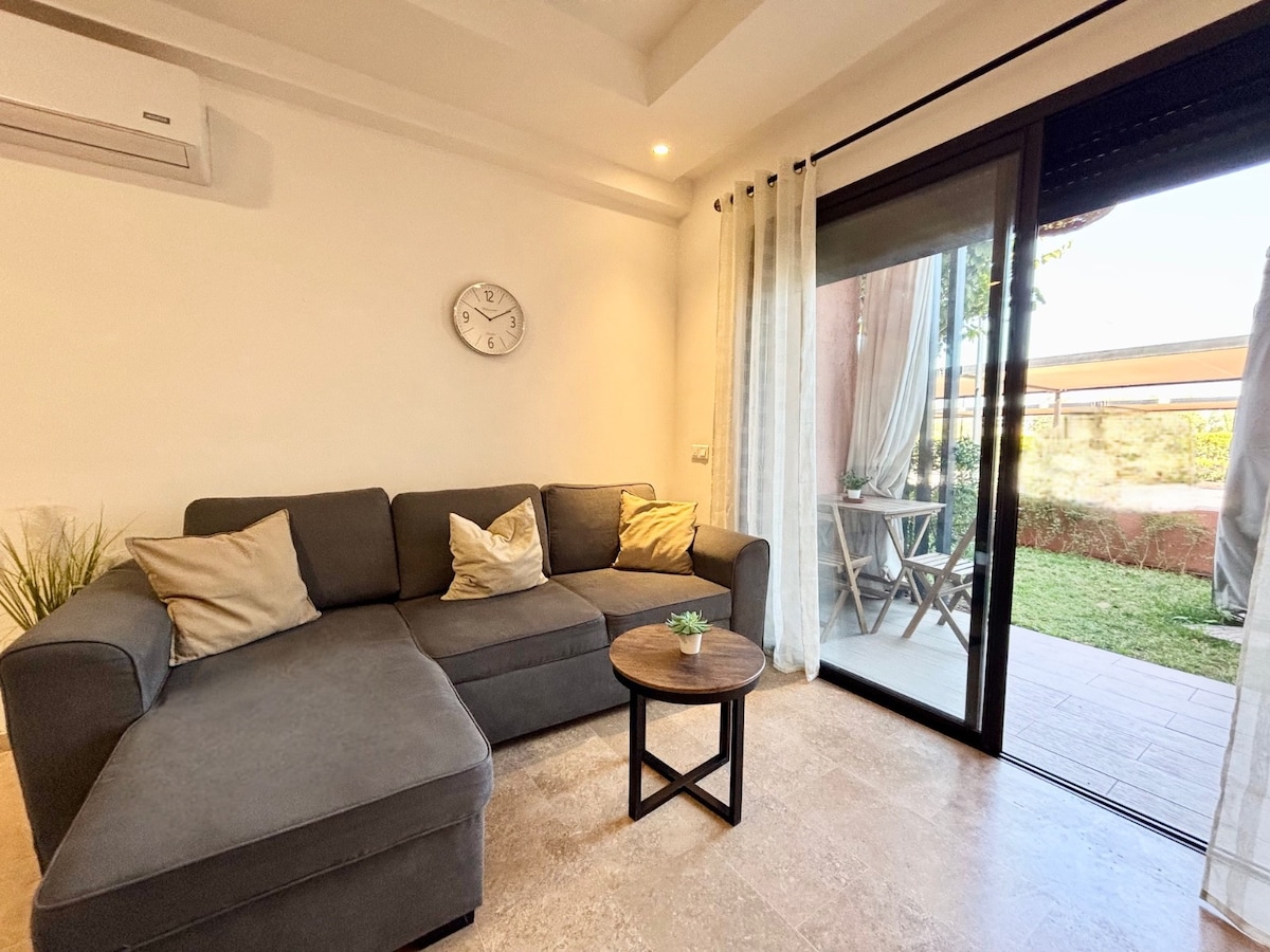 Relax in this bright, fully equipped 1-bedroom apartment located in Domaine de Noria in Marrakech, just 10 min drive from the airport and 15 min from Medina and Hivernage. Perfect for couples or small families. Amenities: Towels + bedsheets Queen bed + Sofa bed Full kitchen Pool High speed Wi-Fi (Optic Fiber) & 2 TVs Balcony AC Private parking with 24/7security Garden & kids’ playground 4min walk to one of the city's best bakeries & Café Baby crib (available upon request)