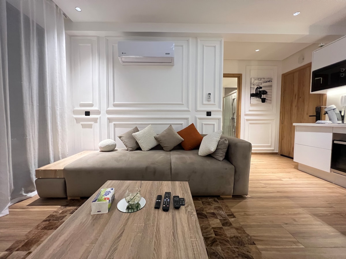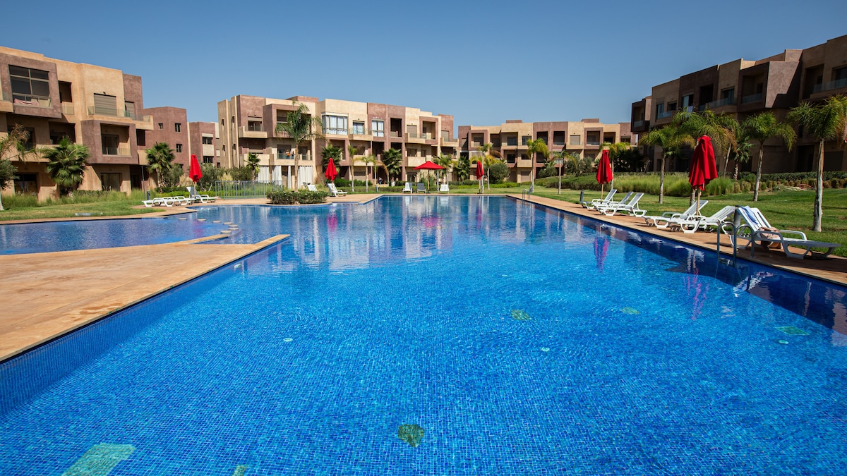 Stunning luxury 2-bedroom apartment in Prestigia Argan Jubea! - 2 bedrooms, 2 bathrooms, 3 balconies - Spacious living room & fully equipped kitchen - SmartTV (x3), WiFi, AC - Free street parking - Self-checkin - 3rd floor, no elevator Amazing location: - Peaceful neighborhood with landscaped gardens and pools - Gated community, 24/7 security - 2min to Oasiria waterpark & Selman Palace - 13mins to Menara mall - 15mins to Gueliz, Jamaa El Fna & airport No unmarried Moroccan/muslim couples