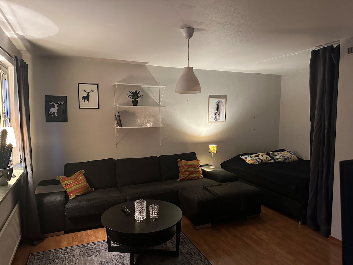 A lovely quaint top floor apartment with beautiful sunsets, double bed plus a sofa bed, kitchen and dining area, shower and bathroor, flatscreen curve TV and fiber internet access. Located a 15 minute walk from the city center across or around the beautiful Skurholms Lake. Close by you have forest walks, the ice road, cross country and down hill skiing, bath house, as well as easy access to a new grocery store, as well as restaurants and entertainment in the city center.