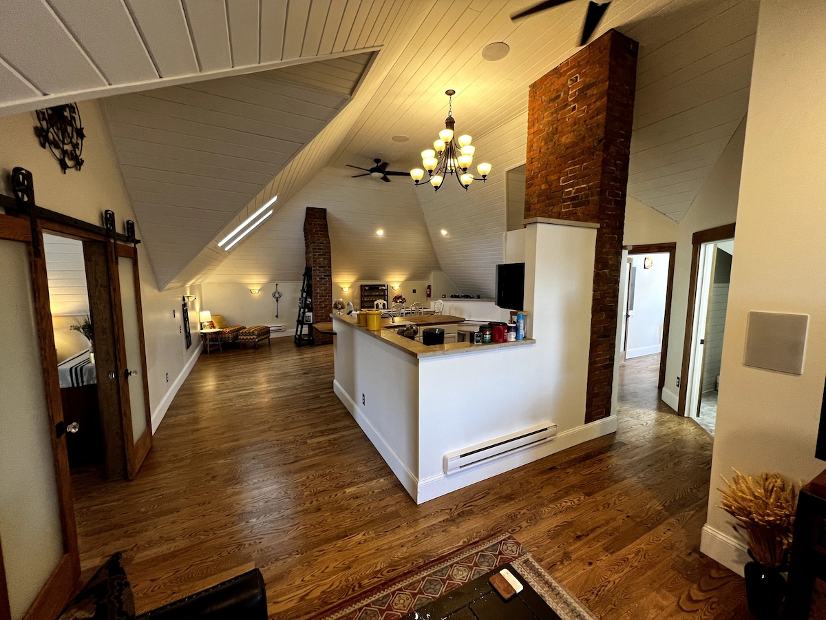 Loft 3 is 40 steps (2 flights of stairs) above the Monroe Square. It's a climb, but the view is totally worth it! Newly remodeled in 2021, and reminiscent of the 1859 character of the building, this space is cute, cozy, and truly one of a kind. Literally a couple steps away from your entryway is Sunrise Donut Cafe, featuring customized donuts and a full menu of excellent coffee items. From there, explore the rest of the Square for food, drinks, and shopping in a quaint Main Street atmosphere.