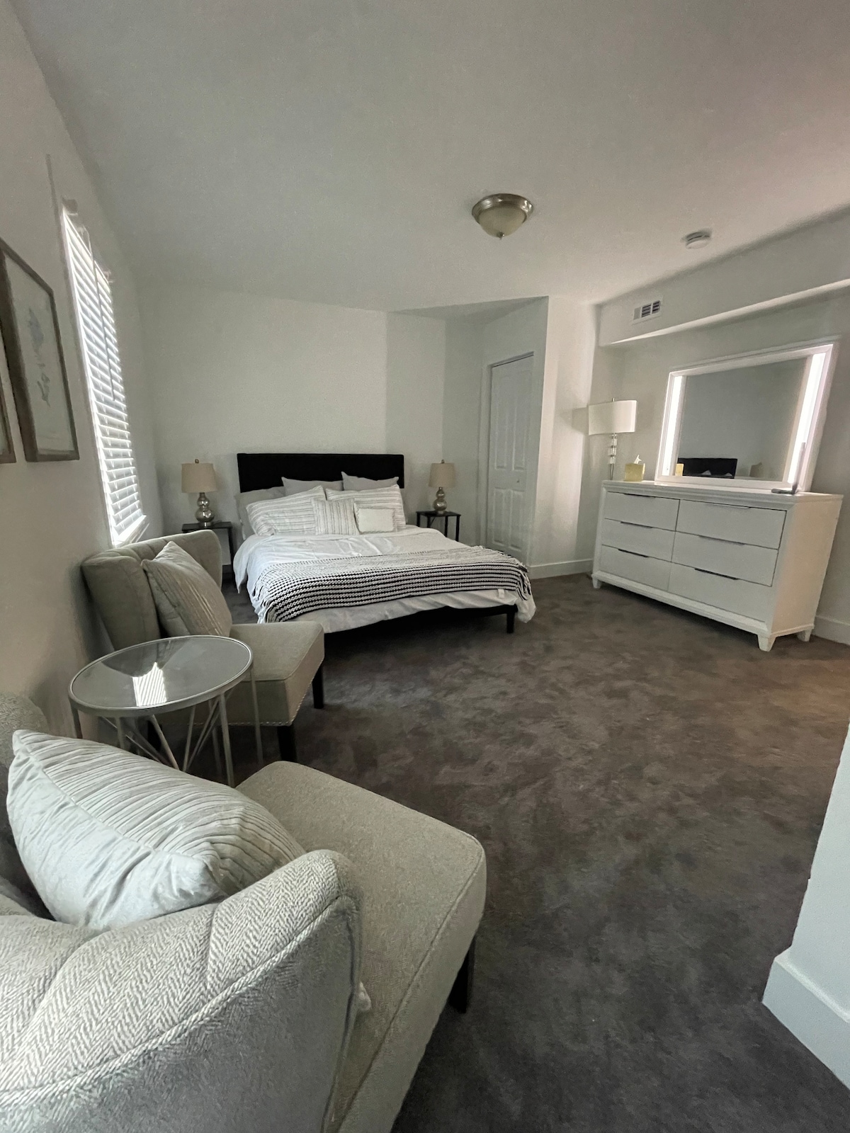 Unit #2. We have a fun, modern decor that showcases a love of our pet friendly home! One parking spot. There are two bedrooms: the primary and a second bedroom room (that we use as a dressing room) both are small rooms with deluxe memory foam Murphy beds - both with attached full bathrooms. Special note: this is our full-time home. We live here and our personal things remain here throughout your stay. Please think of yourself as close friends who have come for a visit - we’ll do the same!